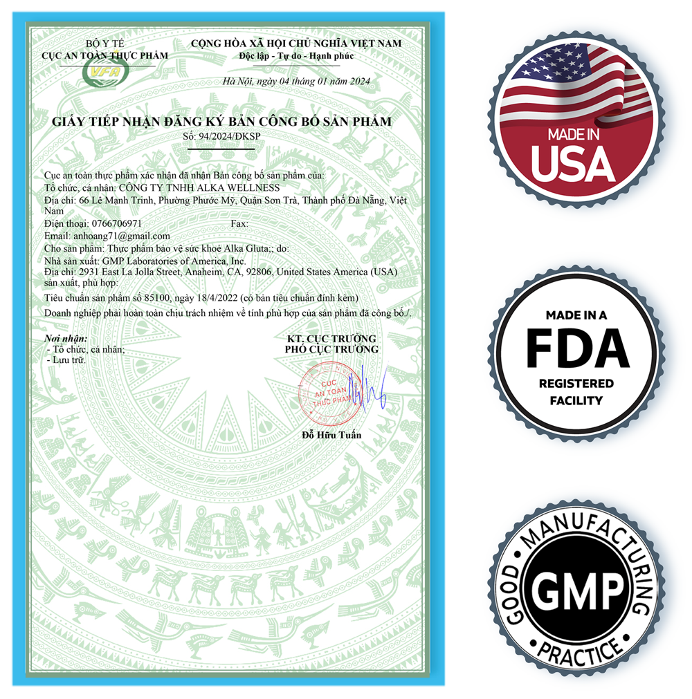 Thực phẩm bảo vệ sức khoẻ Alka Gluta được sản xuất tại nhà máy GMP Laboratories of America, Inc, Hoa Kỳ, nhà máy có hàng loạt chứng nhận tiêu chuẩn quốc tế gồm GMP, FDA, USA Globally Sourced Ingredients….